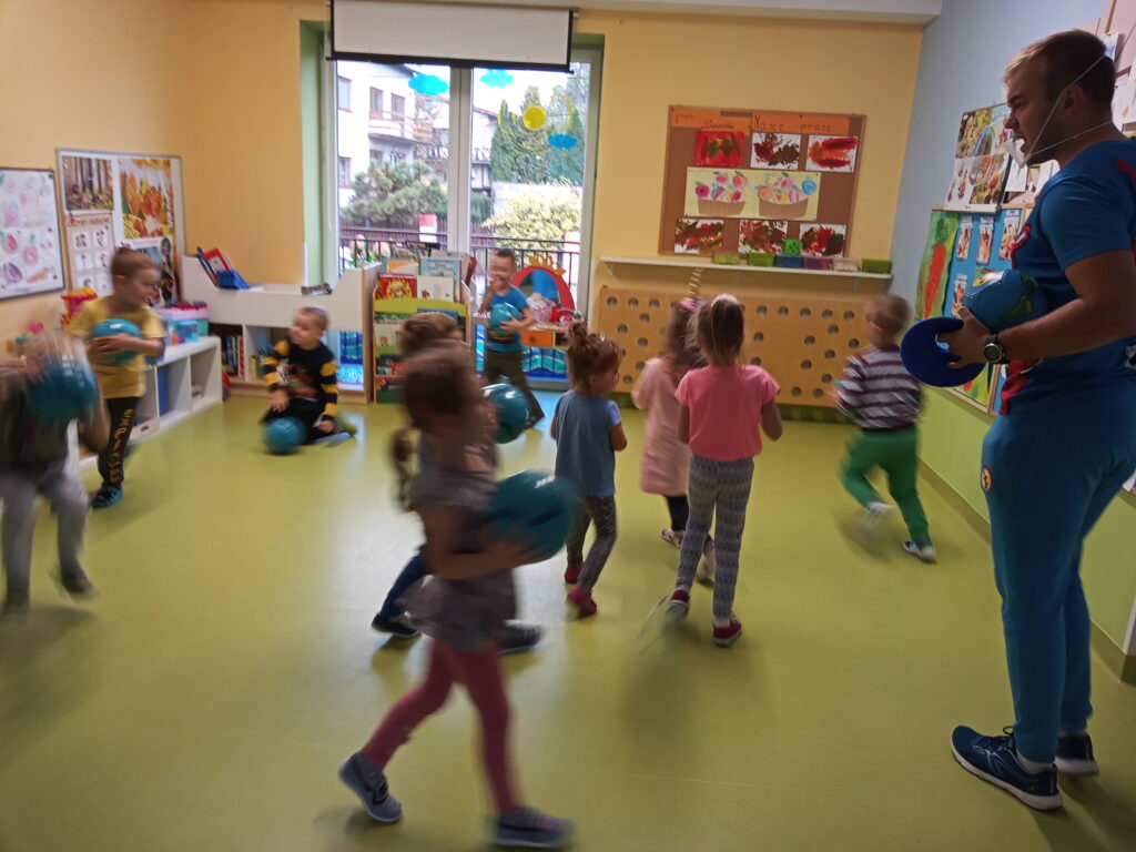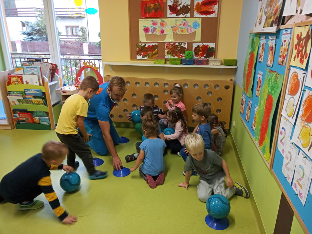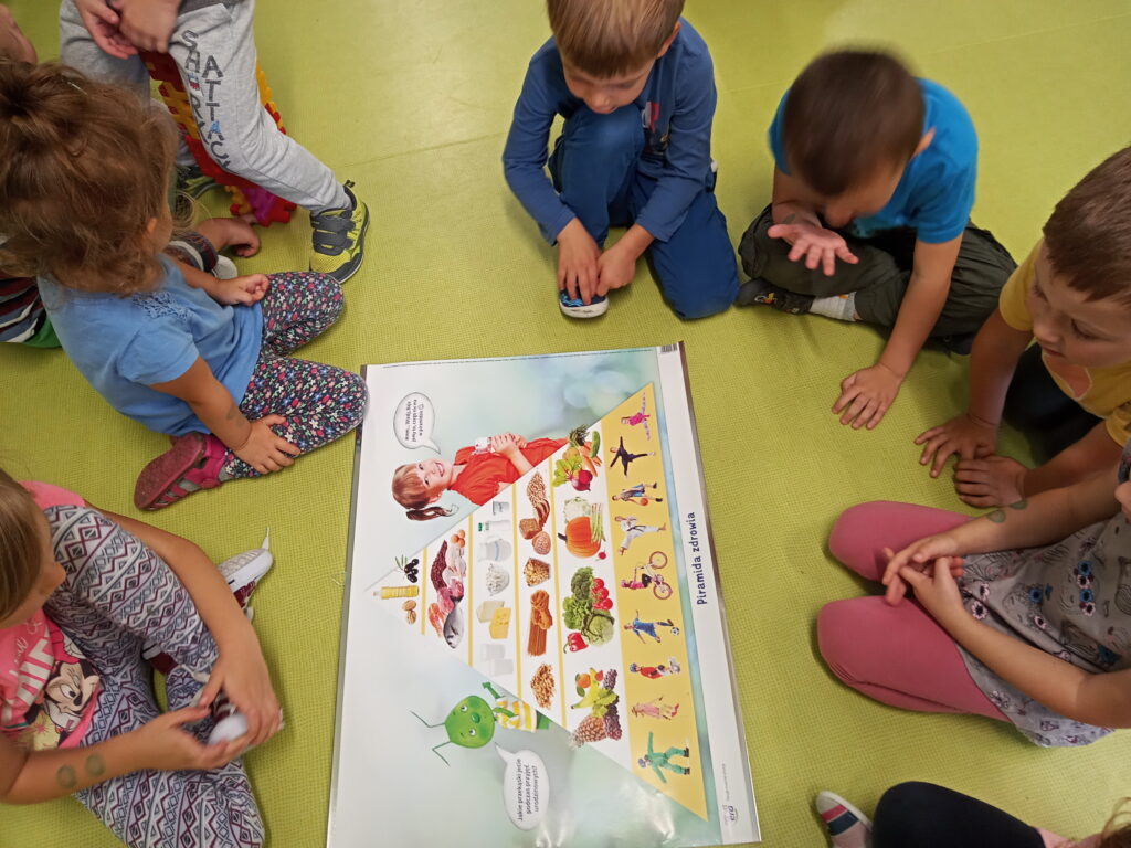 Poznajemy piramidę zdrowego odżywiania i utrwalamy zasady zdrowego stylu życia, m.in. biorąc udział w zdjęciach sportowych drużyny Kangura.